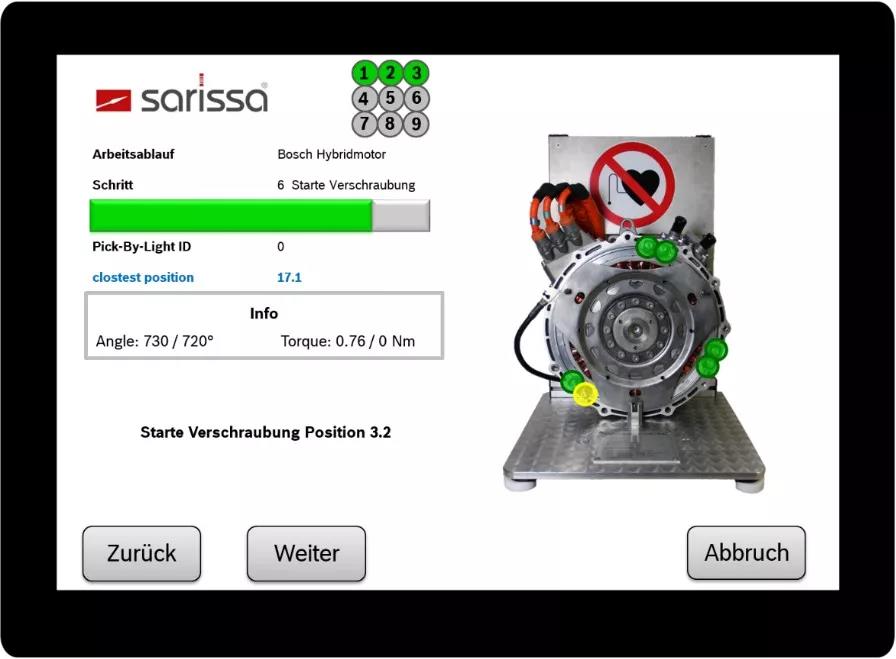 Nexo能通过OpenProtocol通讯协议与Sarissa定位系统连接,实现操作导航。操作导航能监控和指导操作人员的拧紧工作位置序列,并记录工作的完成情况。例如:任务要完成在3个区域中的6个不同连接点的拧紧工作,或是任务要求按照特定的交叉序列来完成拧紧工作,这些操作都不再是难题。