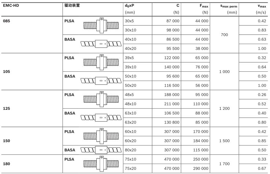 C = 额定动载荷 d 0 = 丝杆传动系统直径 F max = 最大许用轴向力 BASA = 滚珠丝杠传动系统 PLSA = 行星轮丝杠传动系统 P = 丝杠导程 s max perm = 最大许用运行距离 v max = 最大速度